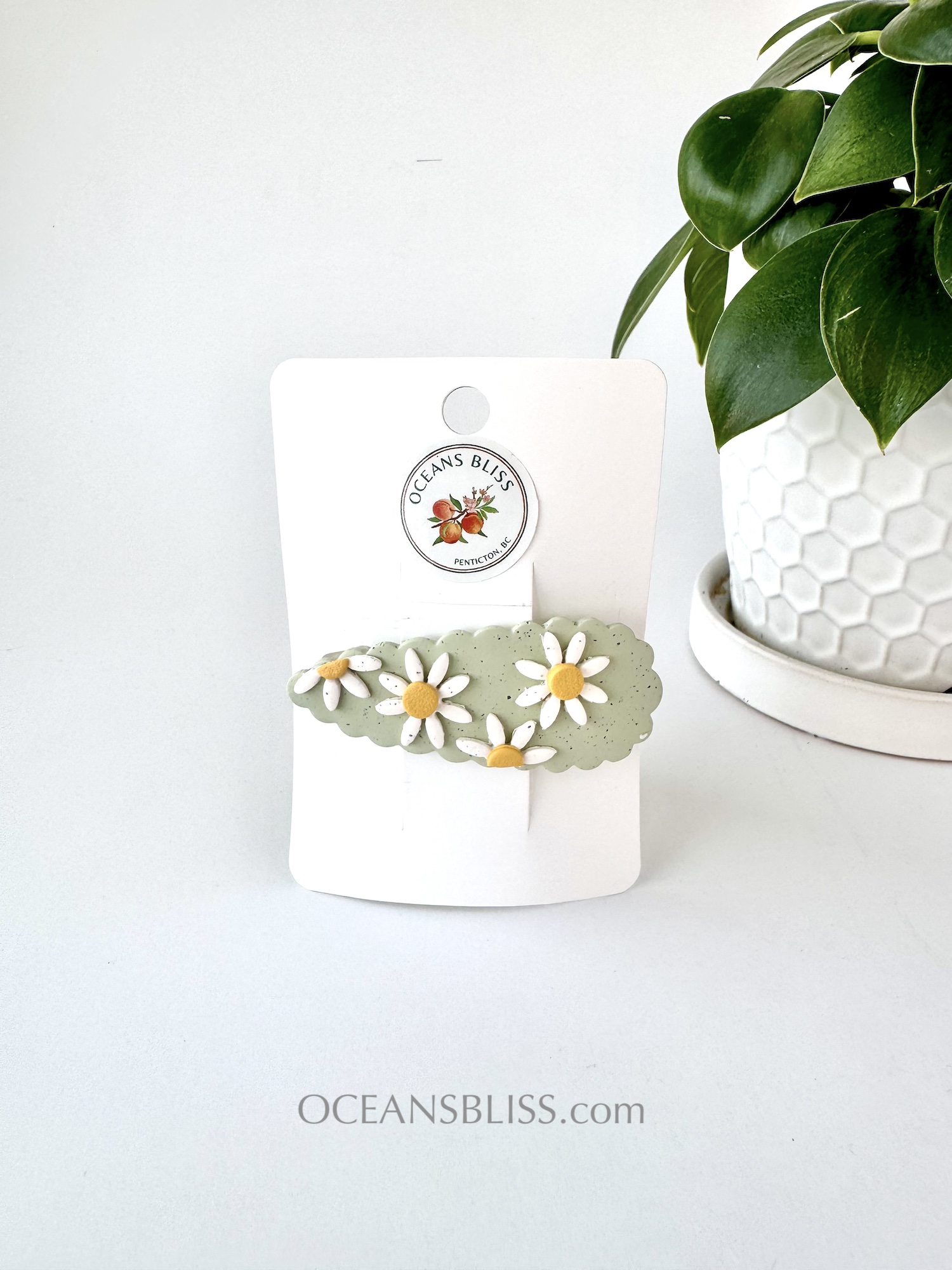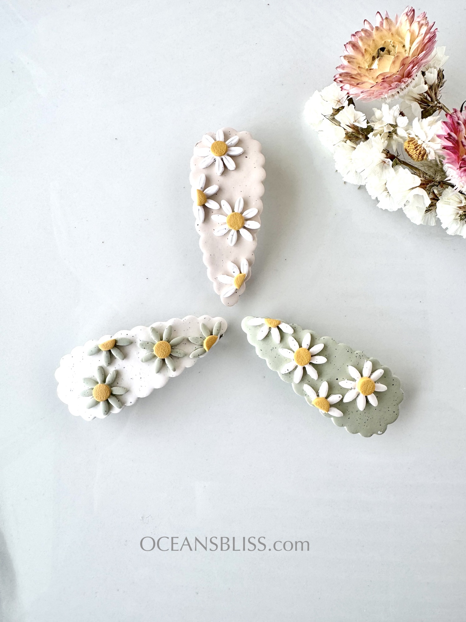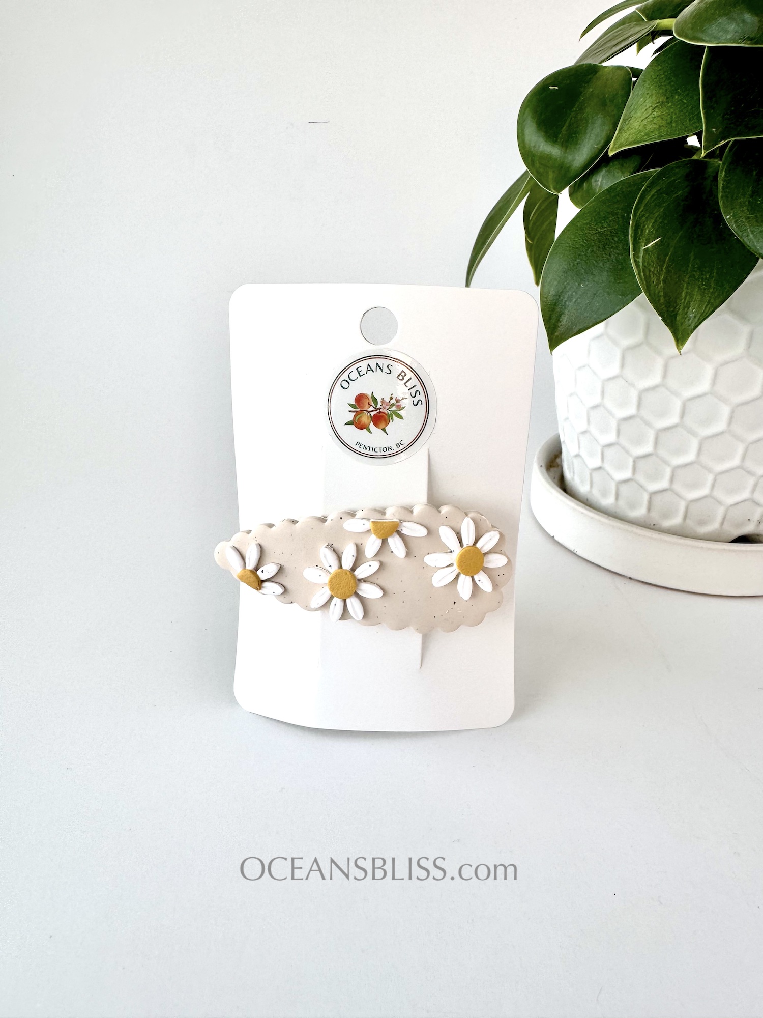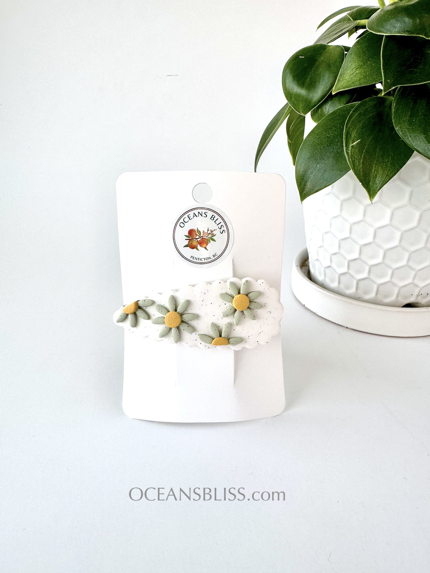Soft, daisy-inspired French barrettes handcrafted from polymer clay and set on a secure no-slip French clip. Designed to stay put in fine hair, they’re lightweight, comfortable, and perfect for effortless half-up styles or soft updos.