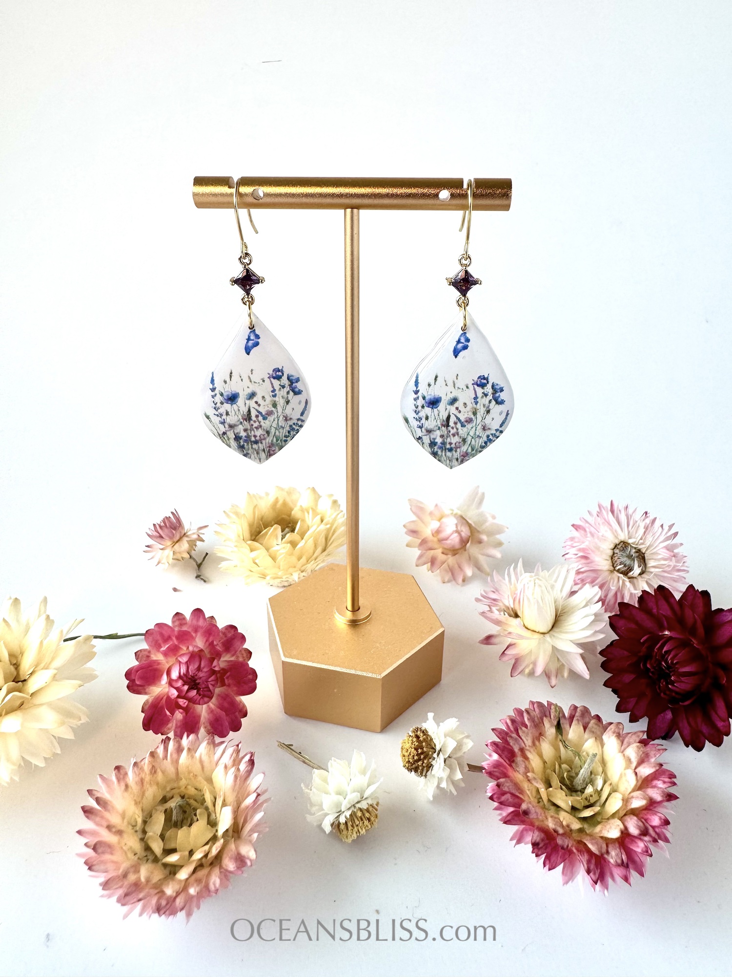 These dangles feature dreamy wildflowers paired with a faceted purple crystal for a touch of subtle sparkle. Handmade with polymer clay and a printed design, they are lightweight and comfortable. Finished with 18k gold-plated hooks.